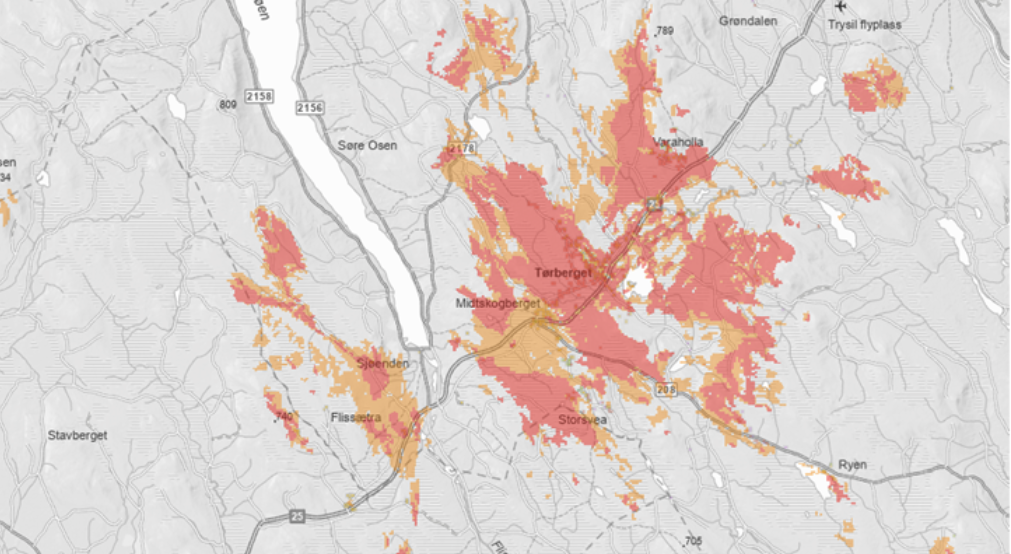 Kart over østre Elverum og vestre Trysil. Røde områder viser at dekningen vil forsvinne helt. Oransje viser hvor kapasiteten kan reduseres.