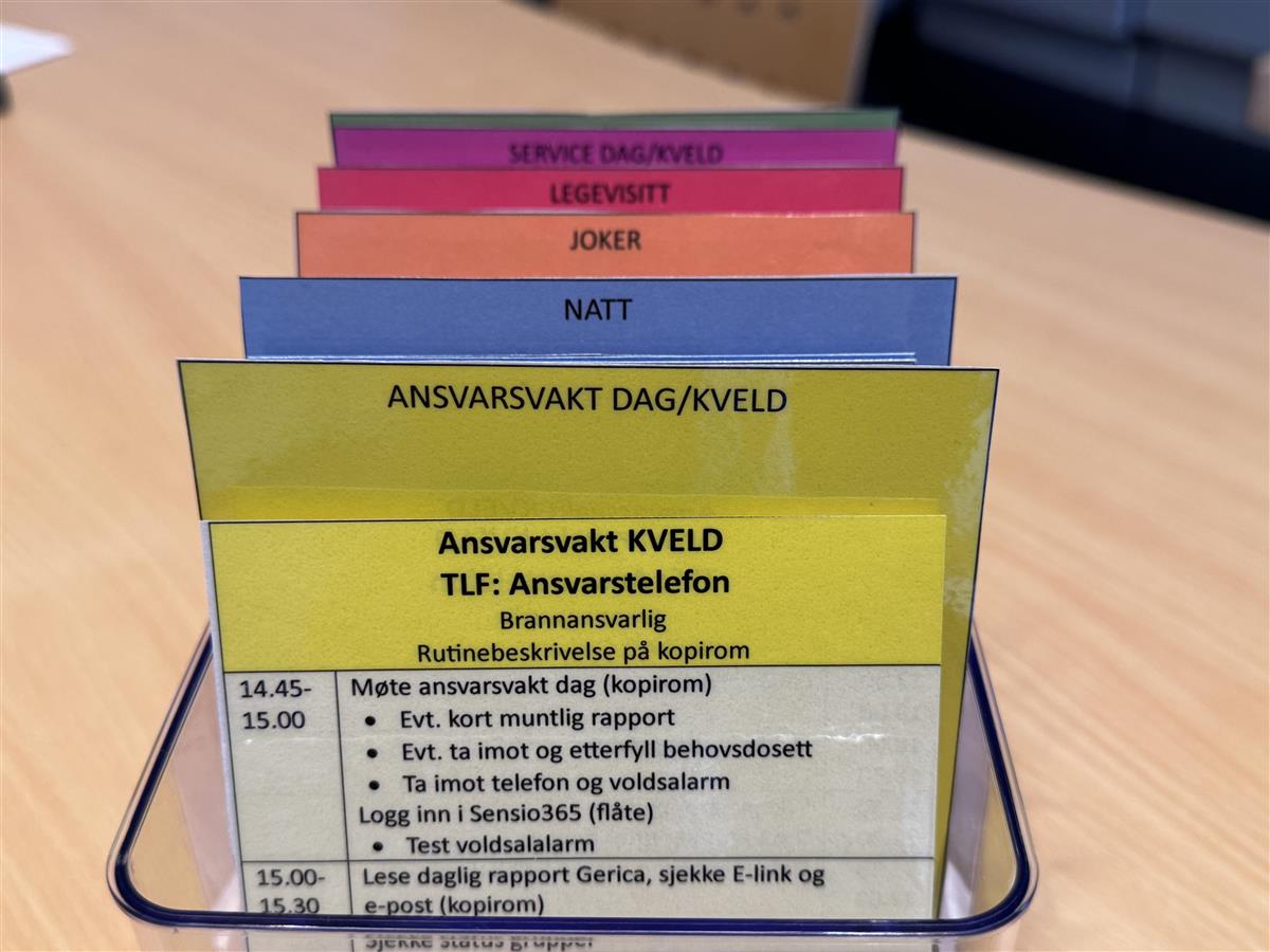 Det er laget oppgavekort til hver vakt.– Det gir oss flere fordeler som mer effektiv bruk av sykepleier/vernepleier, mindre sårbart ved sykdom/ferier, sykepleier/vernepleier blir mer kjent på hele huset noe som er en fordel hvis vi i fremtiden vil slite med å få tak i sykepleier/vernepleier.