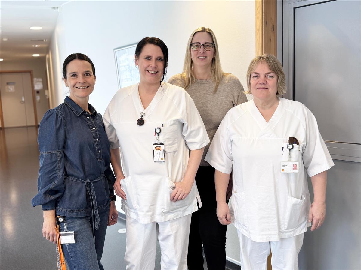 Fra venstre: Assisterende avdelingsleder Trine Lill Bangstad Erlund , sykepleier Lisbeth Kirkelund, vernepleier Irene Buberg og avdelingsleder Lene Nordberg.– Det gjør at vi er nødt til å tenke nytt. Så når vi måtte gjøre om turnusen på grunn av en overordnet rammeavtale for turnus som førte til at vi ikke lenger kunne ha vakter under 6,5 timer, bestemte vi oss for å innføre TØRN og oppgavekort på alle vakter og arbeidsoppgaver i samme prosess, forteller avdelingsleder på Lyngholtet sykehjem, Lene Nordberg.