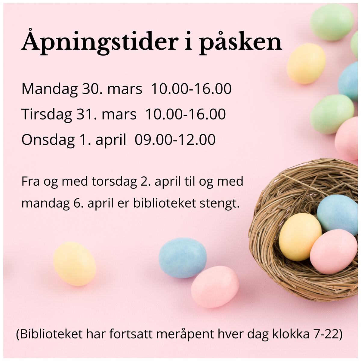 Fra og med torsdag 2. april til og med mandag 6. april er biblioteket stengt.