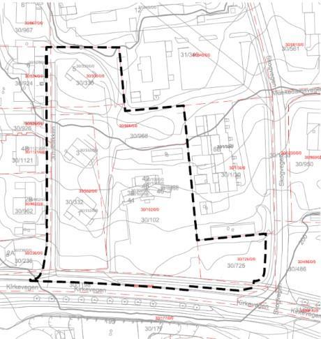 Planområdet er på ca. 10,1 daa og omfatter Kirkevegen 38, 40, 42, 44, 46, 48 og Jutulbakken 1, 3 og 5, gbnr. 30/102, 30/330, 30/332, 30/725 og 30/968.