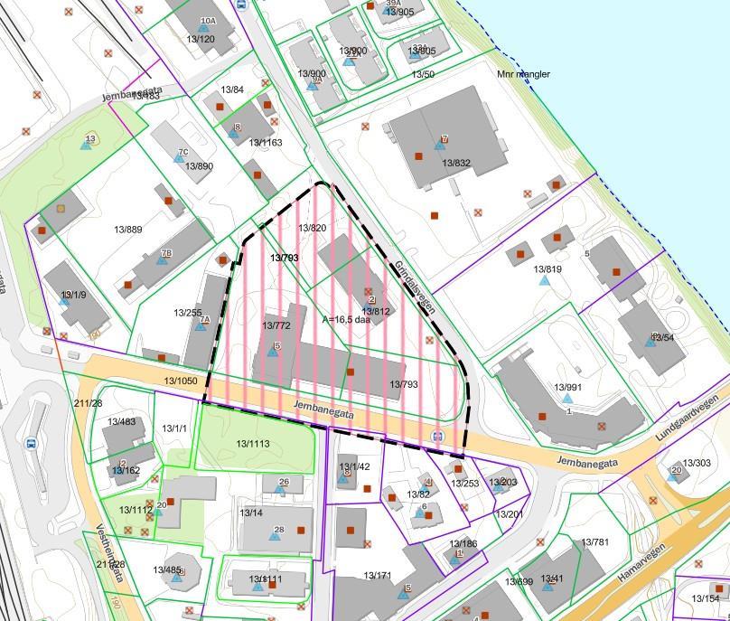 Planområdet er på ca. 16,5 daa og omfatter Jernbanegata 5 og Grindalsvegen 2, gbnr. 13/772, 13/793, 13/812, 13/820, og deler av 13/14, 13/1050, 13/82, 13/253, 13/255 og 13/1/42.